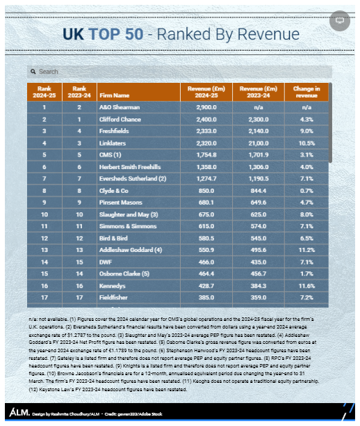 The UK Top 50: Steady Revenue Growth Fails to Deliver PEP Hikes 15 Sept Written By Molly Smith https://www.law.com/international-edition/2025/09/15/the-uk-top-50-steady-revenue-growth-fails-to-deliver-pep-hikes/ Molly Smith